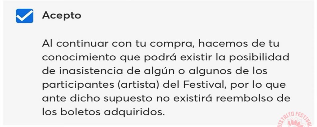 En caso de que el proveedor incumpla las condiciones ofrecidas, salvo que mediara fuerza mayor (enfermedad o accidente), el consumidor tiene derecho a solicitar el reembolso del precio pagado (costo del boleto y cargos por servicio), así como una bonificación o compensación no menor al 20 por ciento, ya sea respecto al total de días que dure el festival o solo del día que no decida asistir el consumido.» – Detalló en su comunicado.