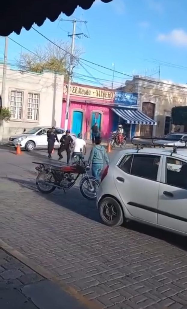 A punto de llegar a los golpes, así captaron a un elemento de seguridad pública y tránsito municipal de Zimapán y un taxista de la misma demarcación quienes discutieron en plena zona centro y al frente de una escuela por un presunto percance vial.